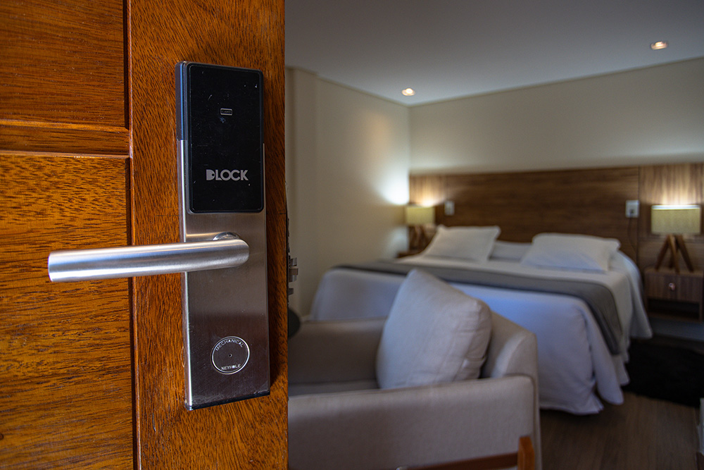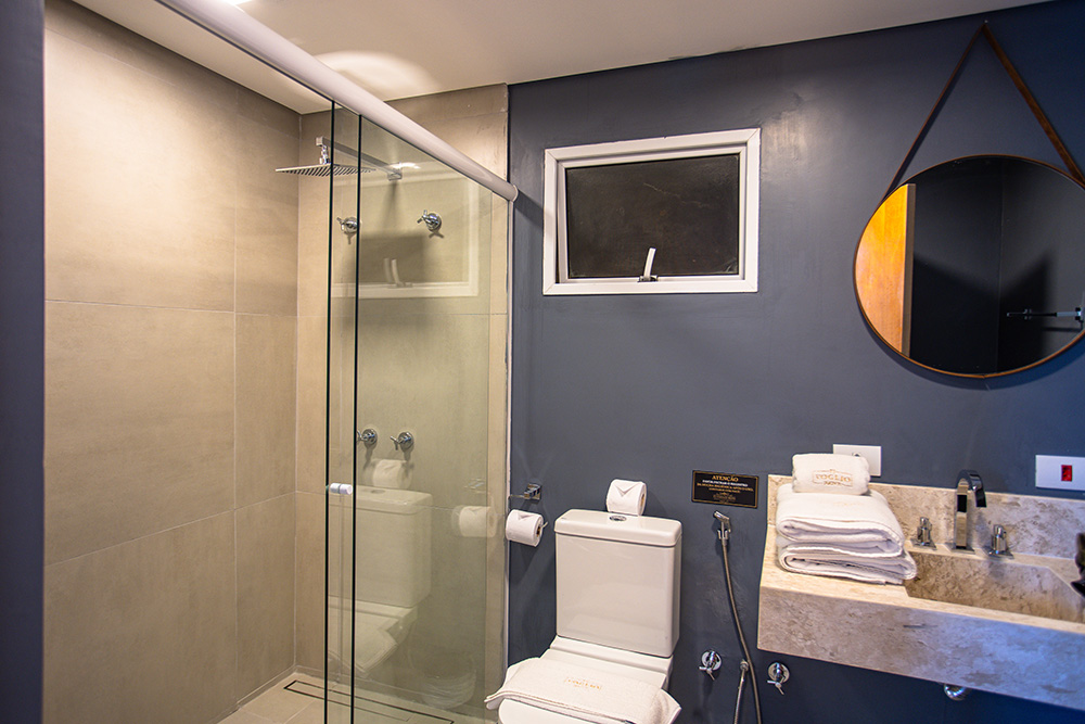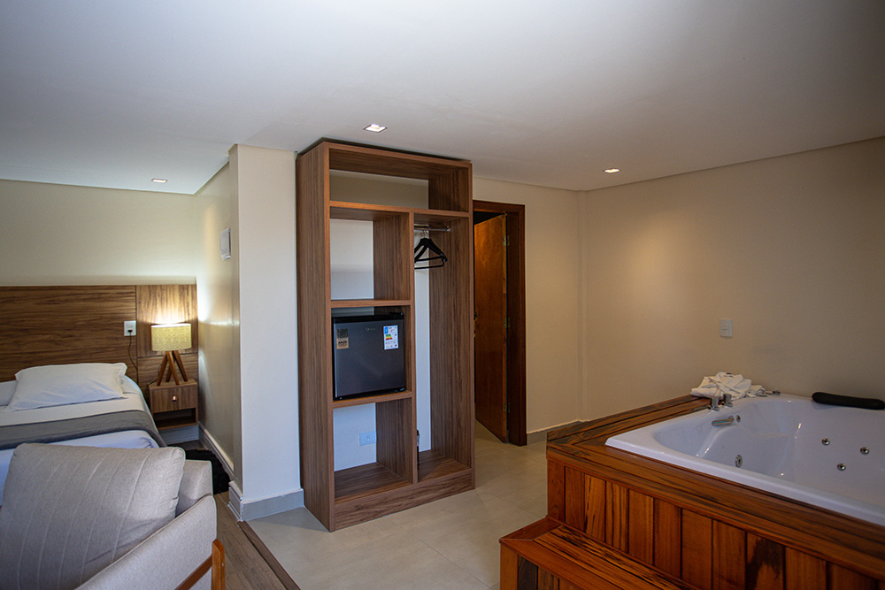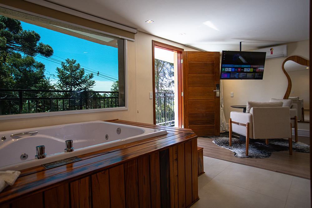A Suíte Premium possui banheira de hidromassagem dupla com vista para a natureza. Localizada no térreo, conta com um ambiente aconchegante, piso de madeira, Smart TV de 43'' e Wi-Fi.