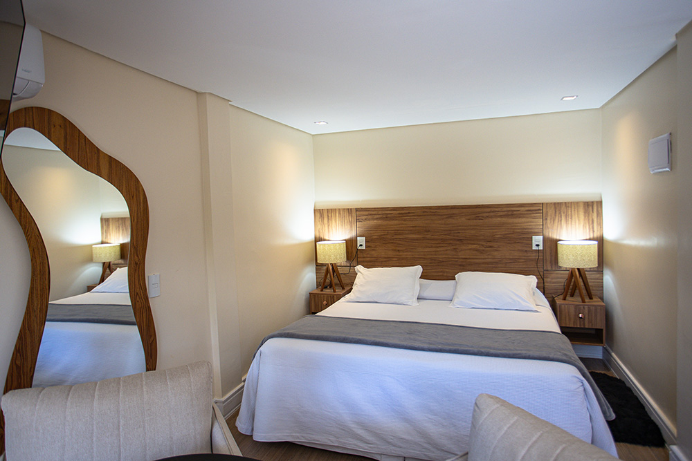 A Suíte Premium possui banheira de hidromassagem dupla com vista para a natureza. Localizada no térreo, conta com um ambiente aconchegante, piso de madeira, Smart TV de 43'' e Wi-Fi.