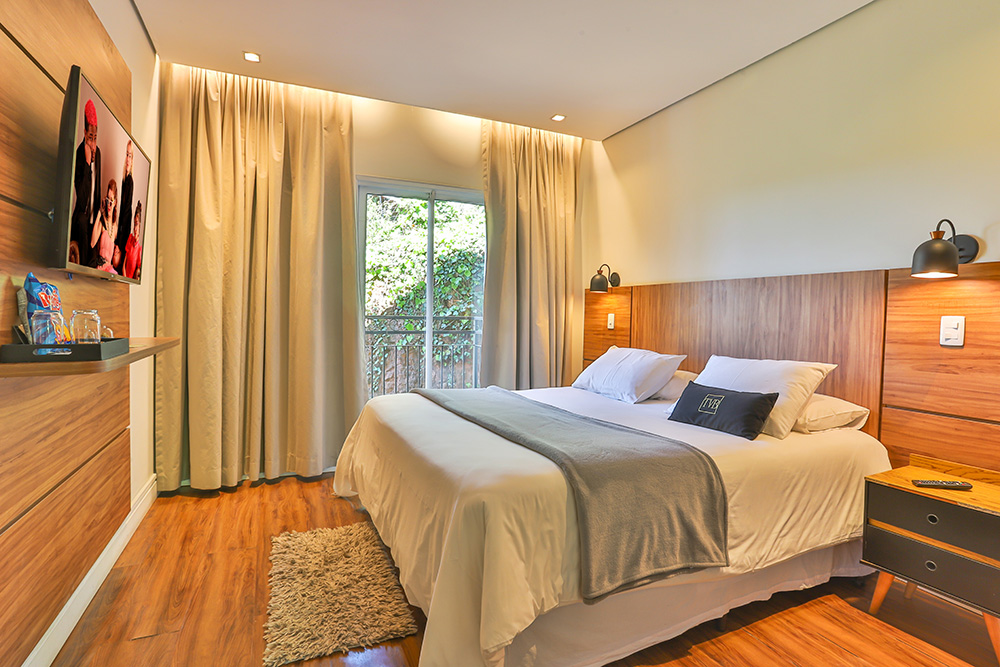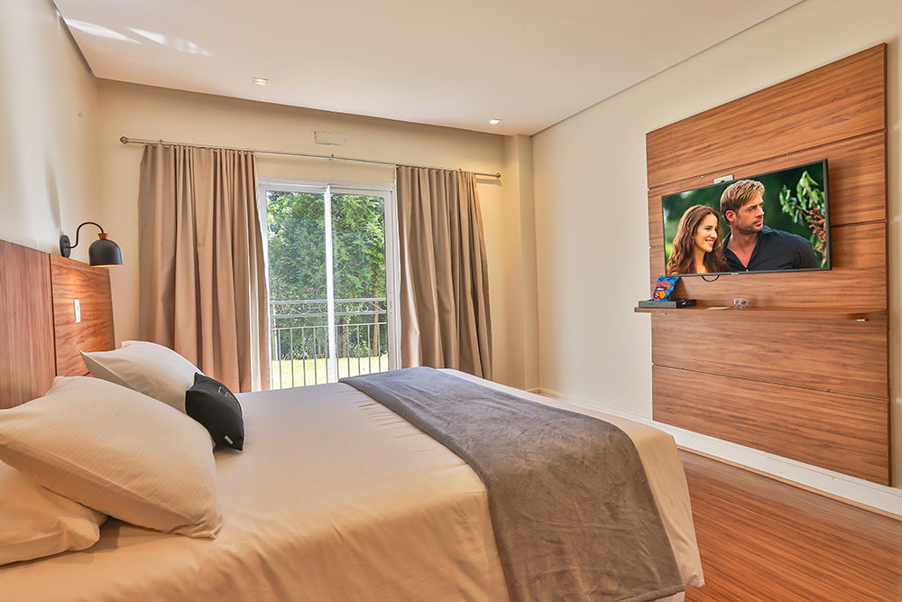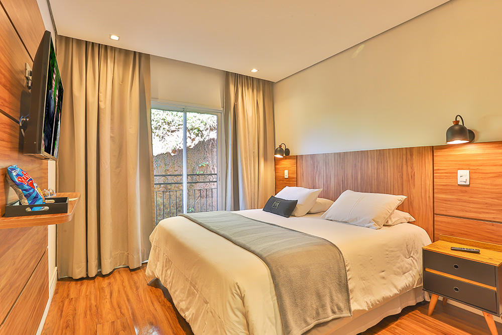 Os apartamentos dessa categoria possuem 26m² , dispõe de varanda com vista para o jardim, e ficam localizados no térreo, contam com um ambiente aconchegante, Smart Tv 43" e wifi.